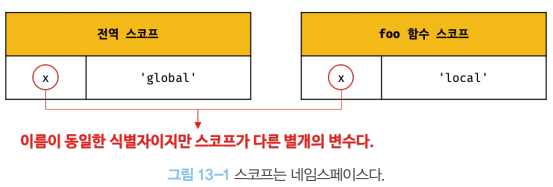 위 예제에서 코드의 가장 바깥 영역에 선언된 x 변수는 어디서든 참조할 수 있다. 하지만 foo 함수 ㄴ부에서 선언된 x 변수는 foo 함수 내부에서만 참조할 수 있고 foo 함수 외부에서는 참조할 수 없다. 이때 두 개의 x변수는 식별자 이름이 동일하지만 자신이 유효한 범위, 즉 스코프가 다른 별개의 변수다.