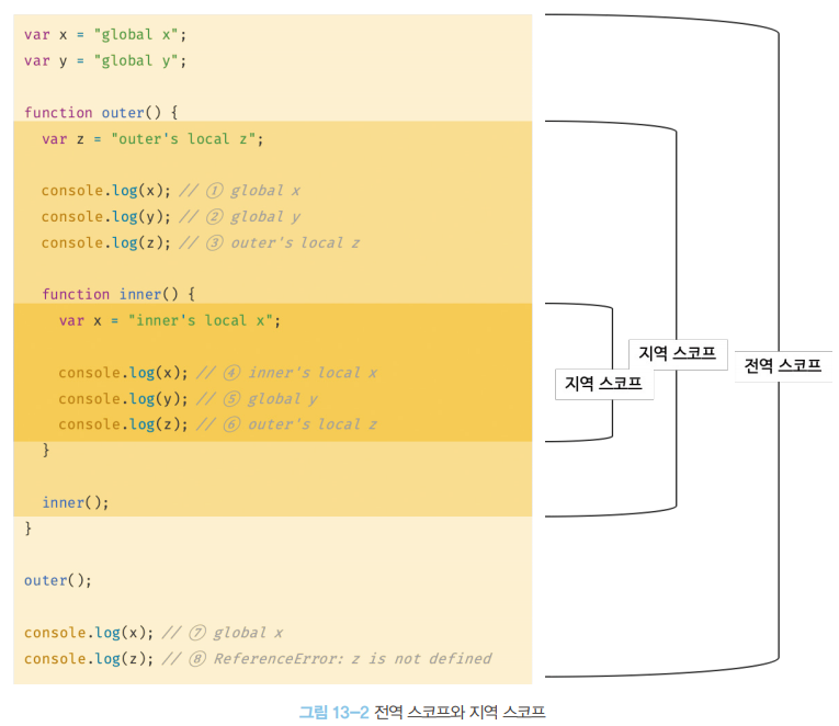 함수는 중첩될 수 있으므로 함수의 지역 스코프도 중첩될 수 있다. 이는 스코프가 함수의 중첩에 의해 계층적 구조를 갖는다는 것을 의미한다. 다시 말해, 중첩 함수의 지역 스코프는 중첩 함수를 포함하는 외부 함수의 지역 스코프와 계층적 구조를 갖는다. 이때 외부 함수의 지역 스코프를 중첩 함수의 상위 스코프라 한다.