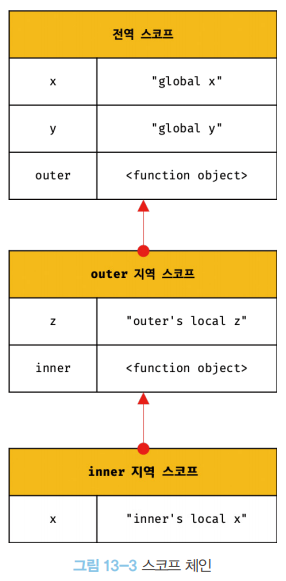 이렇게 스코프가 계층적으로 연결된 것을 스코프 체인이라 한다. 위 그림에서 스코프 체인은 최상위 스코프인 전역 스코프, 전역에서 선언된 outer 함수의 지역 스코프, outer 함수 내부에서 선언된 inner 함수의 지역 스코프로 이뤄진다.