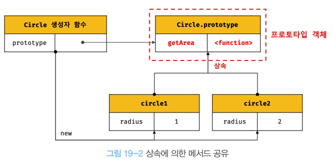 Circle 생성자 함수가 생성한 모든 인스턴스는 자신의 프로토타입, 즉 상위(부모) 객체 역할을 하는 Circle.prototype의 모든 프로퍼티와 메서드를 상속받는다.