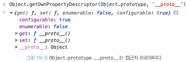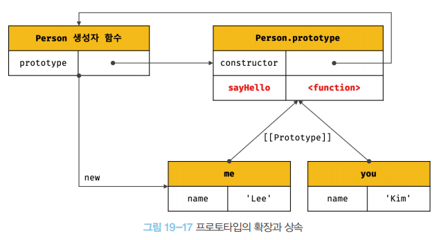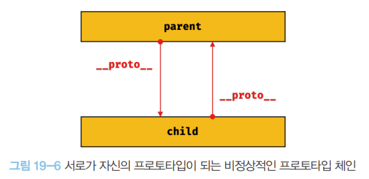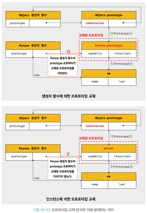 이처럼 프로토타입 교체를 통해 객체 간 상속 관계를 동적으로 변경하는 것은 꽤나 번거롭다. 따라서 프로토타입은 직접 교체하지 않는 것이 좋다. 상속 관계를 인위적으로 설정하려면 19.11절 “직접 상속”에서 살펴볼 직접 상속이 더 편리하고 안전하다. 또는 ES6에서 도입된 클래스를 사용하면 간편하고 직관적으로 상속관계를 구현할 수 있다. 이에 대해서는 25장 “클래스”에서 자세히 살펴보도록 하자.