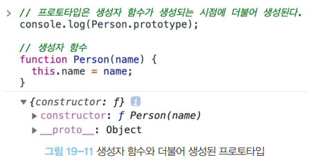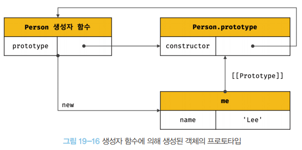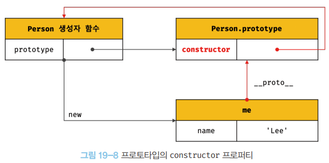 프로토타입으로 교체한 객체 리터럴에는 constructor 프로퍼티가 없다. constructor 프로퍼티는 자바스크립트 엔진이 프로토타입을 생성할 때 암묵적으로 추가한 프로퍼티다. 따라서 me 객체의 생성자 함수를 검색하면 Person이 아닌 Object가 나온다.