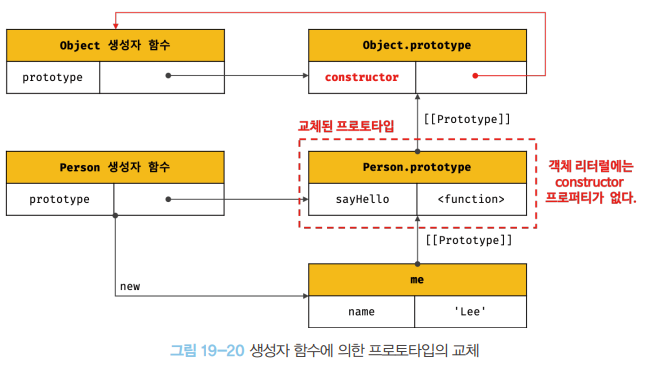 19.9.1절 “생성자 함수에 의한 프로토타입 교체”와 마찬가지로 프로토타입으로 교체한 객체에는 constructor 프로퍼티가 없으므로 constructor 프로퍼티와 생성자 함수 간의 연결이 파괴된다. 따라서 프로토타입의 constructor 프로퍼티로 me 객체의 생성자 함수를 검색하면 Person이 아닌 Object가 나온다.