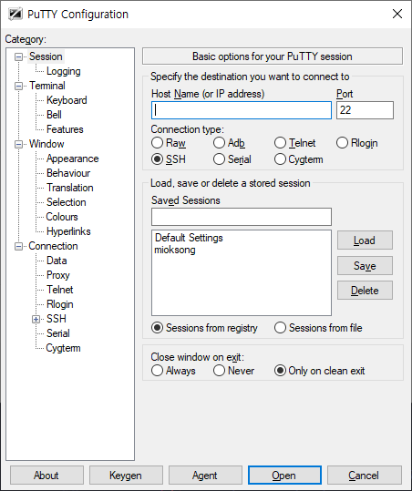 - 처음 환경 설정을 저장할 때 Saved Sessions 칸에 적당한 이름을 입력하고 아래의 Save 버튼을 클릭하면 저장되며, 기존에 저장되어 있는 경우 해당 이름을 선택한 후 Save 버튼을 클릭하면 환경 설정이 덮어쓰기 된다.