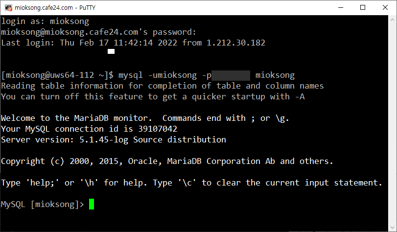 서버에 접속 후 mysql 정보를 입력하여 DB에 접속한다.