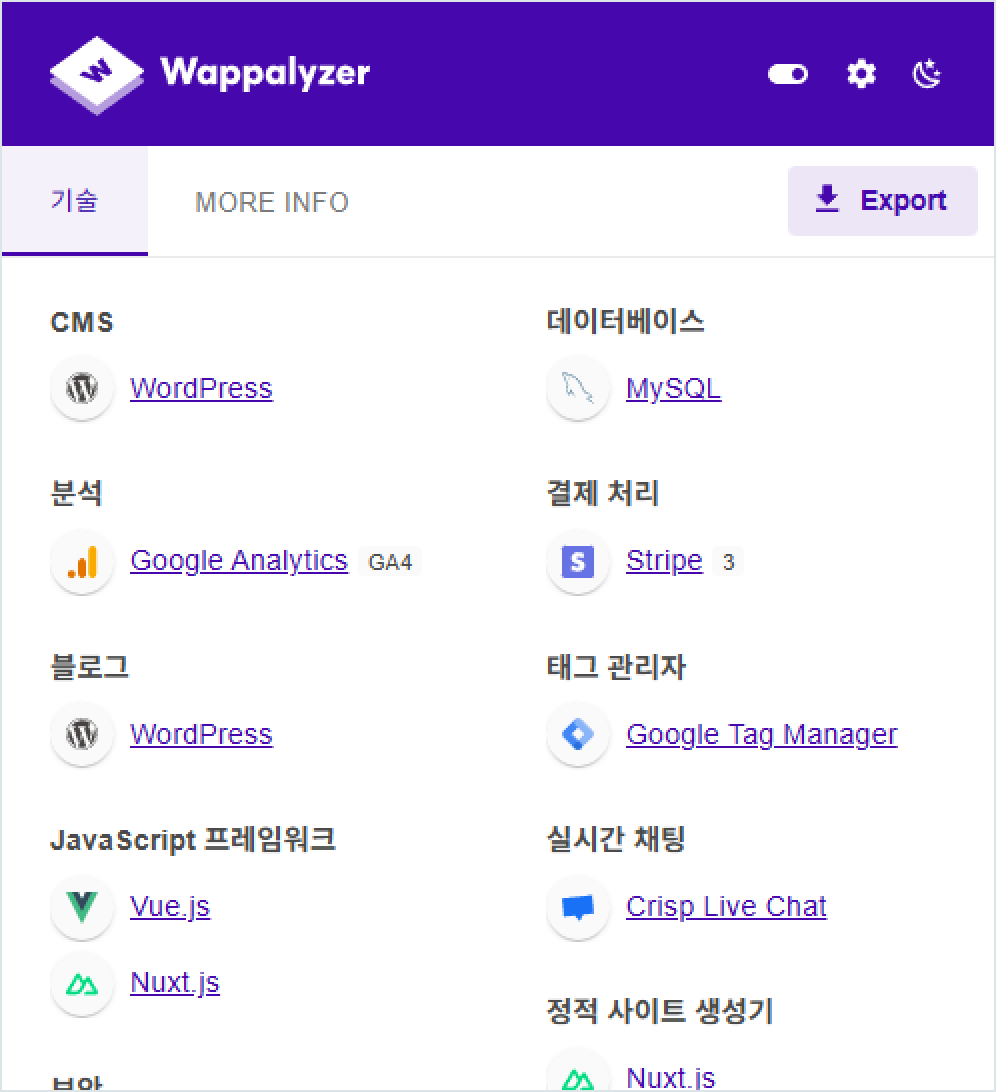 아래 이미지는 Wappalyzer 공식 사이트의 상태 값이다.