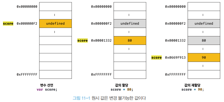 변수가 참조하던 메모리 공간의 주소가 변경된 이유는 변수에 할당된 원시 값이 변경 불가능한 값이기 때문이다.