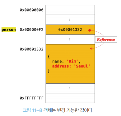 위 예제에서 person 변수는 객체 { name: ‘Lee’ }를 가리키고(참조하고) 있다.