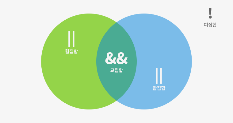 &&): 하나라도 거짓이면 거짓, 모두 참이어야 참 (이항연산자) - 합집합 (