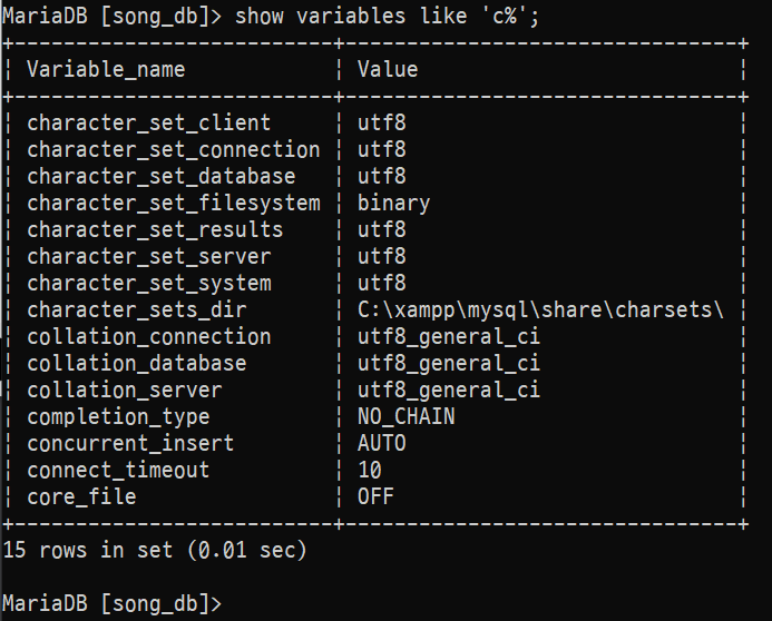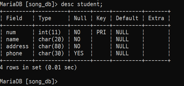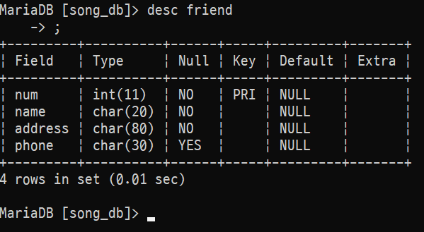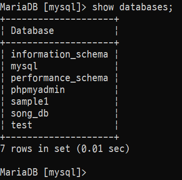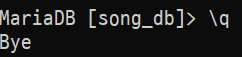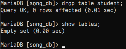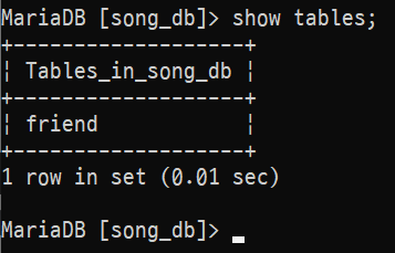 mysql>use song_db // use 명령을 사용해 작업하려는 데이터베이스 선택