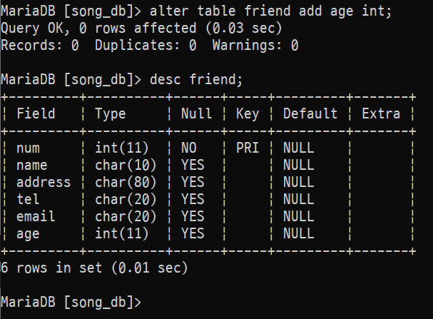 mysql>alter table friend add age int; // friend 테이블에 age 필드를 정수형으로 추가 (제일 마지막에 추가됨)