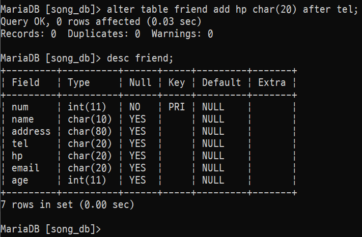 mysql>alter table friend add hp char(20) after tel; // tel 필드 바로 다음에 hp필드를 추가