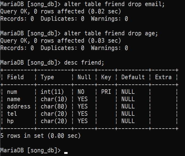 mysql>alter table friend drop age, drop hp; // age, hp 필드 삭제