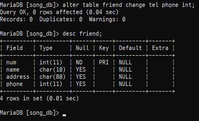 mysql>alter table friend change tel phone int; // tel 필드를 phone 필드 정수형으로 수정