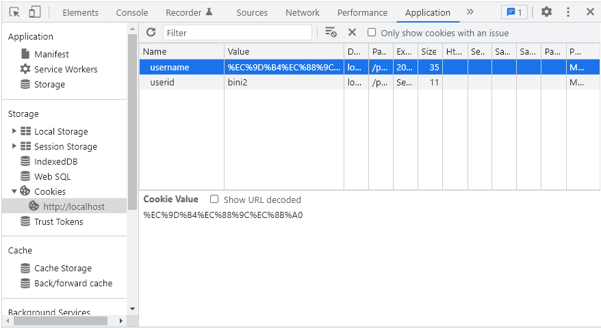저장된 쿠키 정보는 구글 개발자모드(F12) Application 탭 Cookie에서 확인 가능하다.