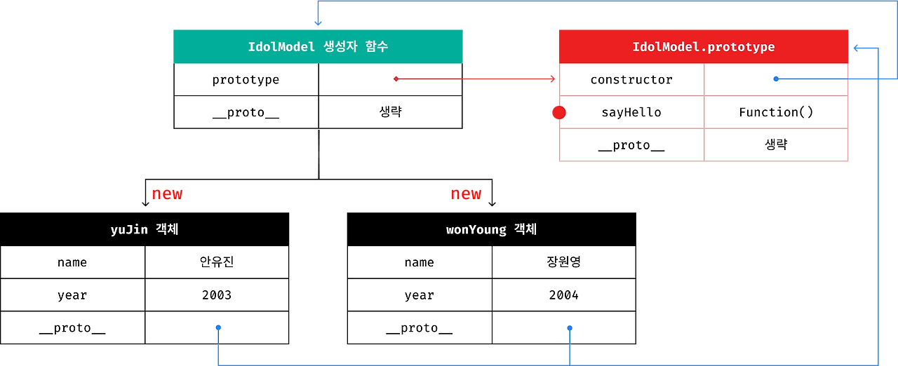 yuJin 객체와 wonYoung 객체가 IdolModel.prototype의 sayHello() property를 상속받았다.