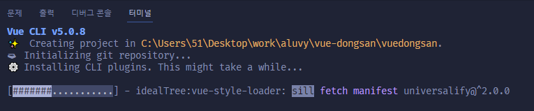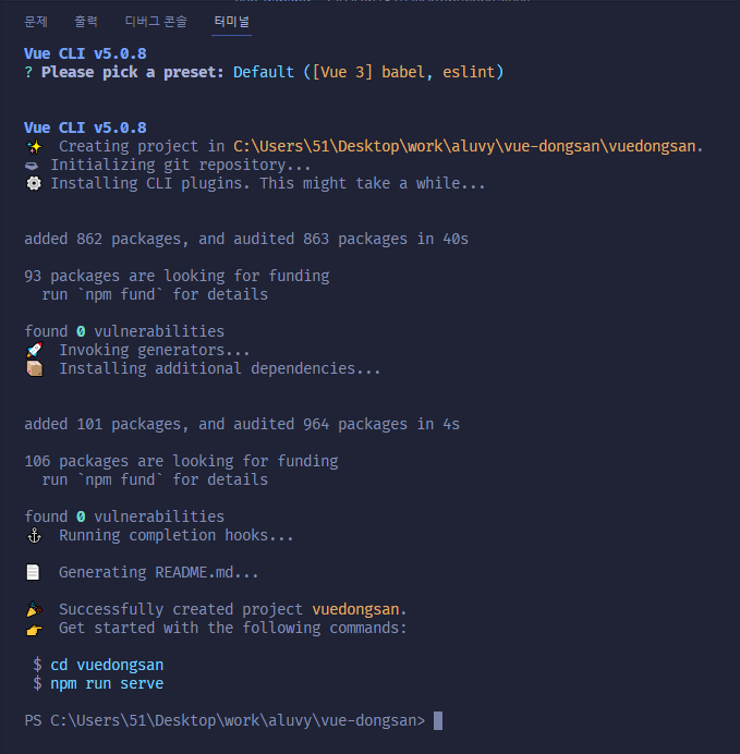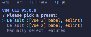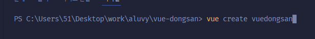 터미널에서 vue 프로젝트를 생성한다. (프로젝트 명으로 폴더가 생성된다.)