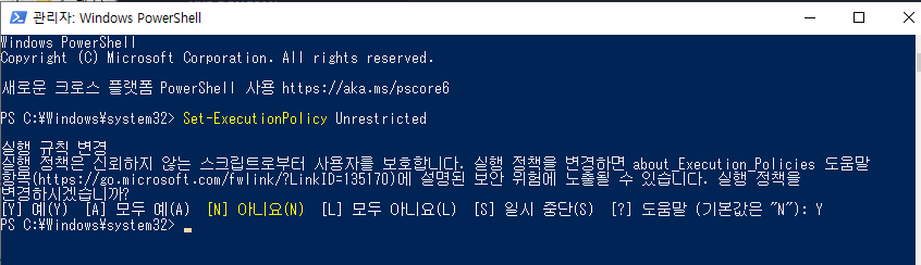 윈도우 검색메뉴(돋보기) - Powershell 검색 - 우클릭 - 관리자권한으로 실행한 뒤